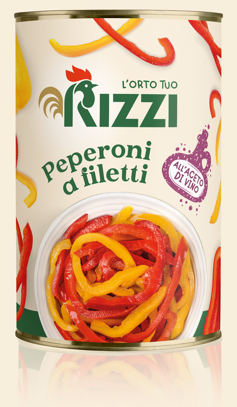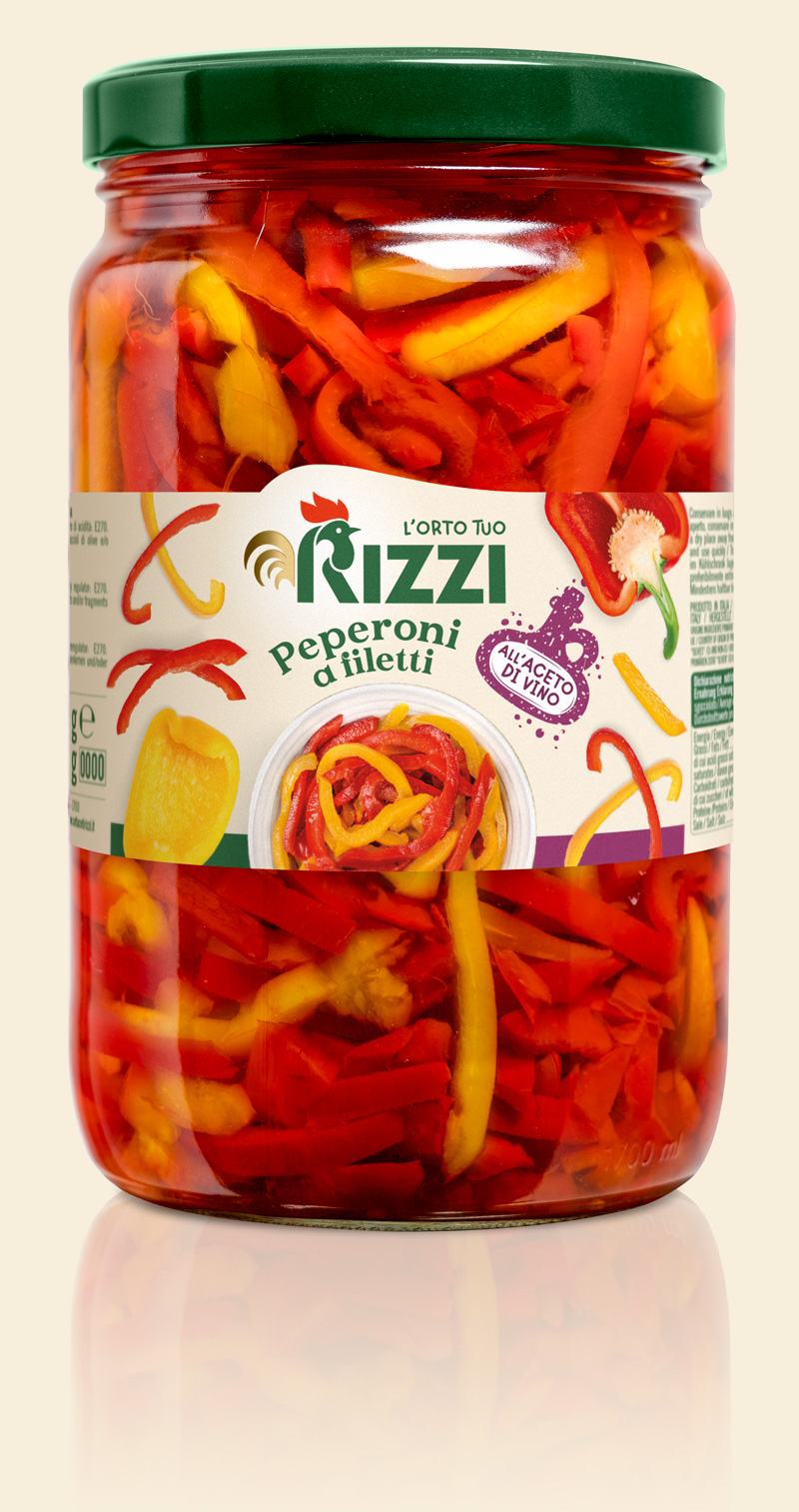 Peperoni rossi e gialli tagliati dal fresco a filetti conservati in aceto di vino. Per antipasti, pizze, primi piatti, contorni e piatti di fantasia.